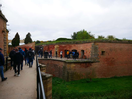 Der Samstag war dann nach dem Frühstück eine Herausforderung für unsere Gruppe. Mit unserem Bus sind wir nach Theresienstadt gefahren und sahen uns mit der dunklen Vergangenheit der Geschichte konfrontiert. In der sogenannten kleinen Festung dort, die von den Österreichern errichtet wurde, gab es ausgehend im 18. Jahrhundert ein großes Gefängnis, in dem auch der Attentäter auf den Kaiser, Gavrilo Principe, inhaftiert war, welcher durch seine Tat den 1. Weltkrieg ausgelöst hatte. Diese Festung hatten aber dann die Deutschen im 2. Welt-krieg schnell für sich und ihre Belange in Gebrauch genommen. Unzählige Menschen, zunächst Politiker und Geistliche, später dann vor allem jüdische Mitbürger/innen aus Böhmen und Mähren wurden dort inhaftiert, traktiert und getötet. Eine eigenartige Stimmung machte sich auch bei uns breit, als wir die Örtlichkeit mit einem Angestellten durchschritten haben. Doch dies war nur der eine Teil von Theresienstadt. Grausam auch die Methoden in der nahen Stadt, in der das NS-Regime die Menschen in ein Ghetto einquetschten. Wo vormals knapp 4.000 Menschen lebten, schaffte es das Regime schließlich weit über 70.000 Menschen einzusperren, ehe man viele von ihnen in die Konzentrationslager deportiert hatte. Das unzählige Leid und das Gesehene berührte uns sehr.